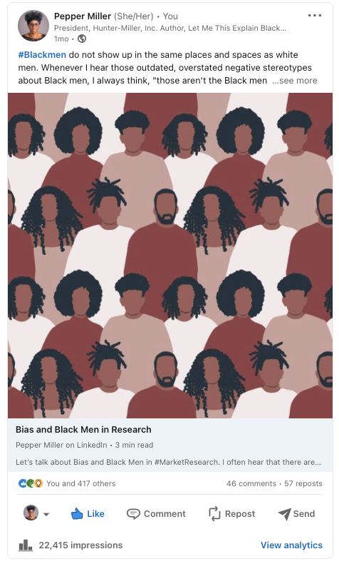 Pepper Miller is a premier market researcher. An expert on America’s Black consumer market, she studies and lectures with corporations, media platforms, and colleges and universities on Black consumer behavior patterns and behavior.
